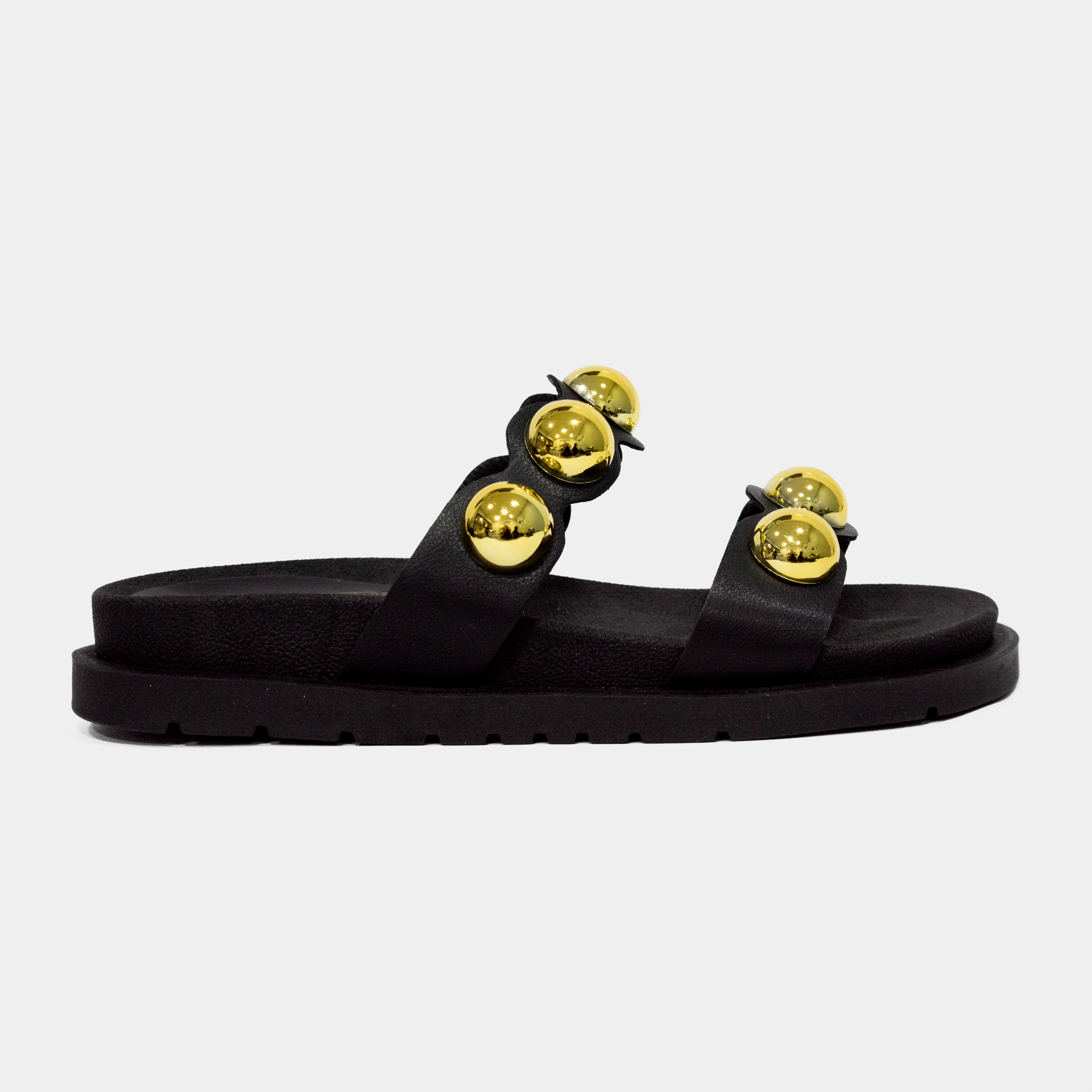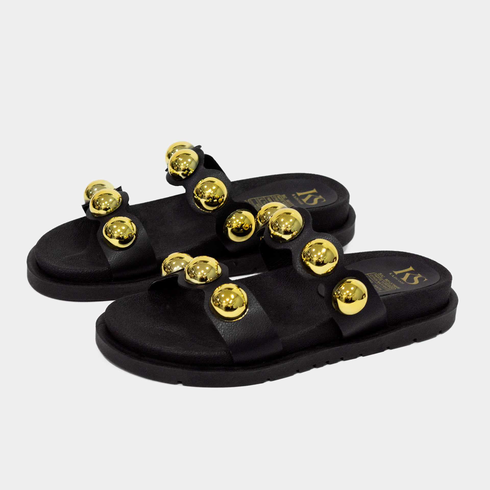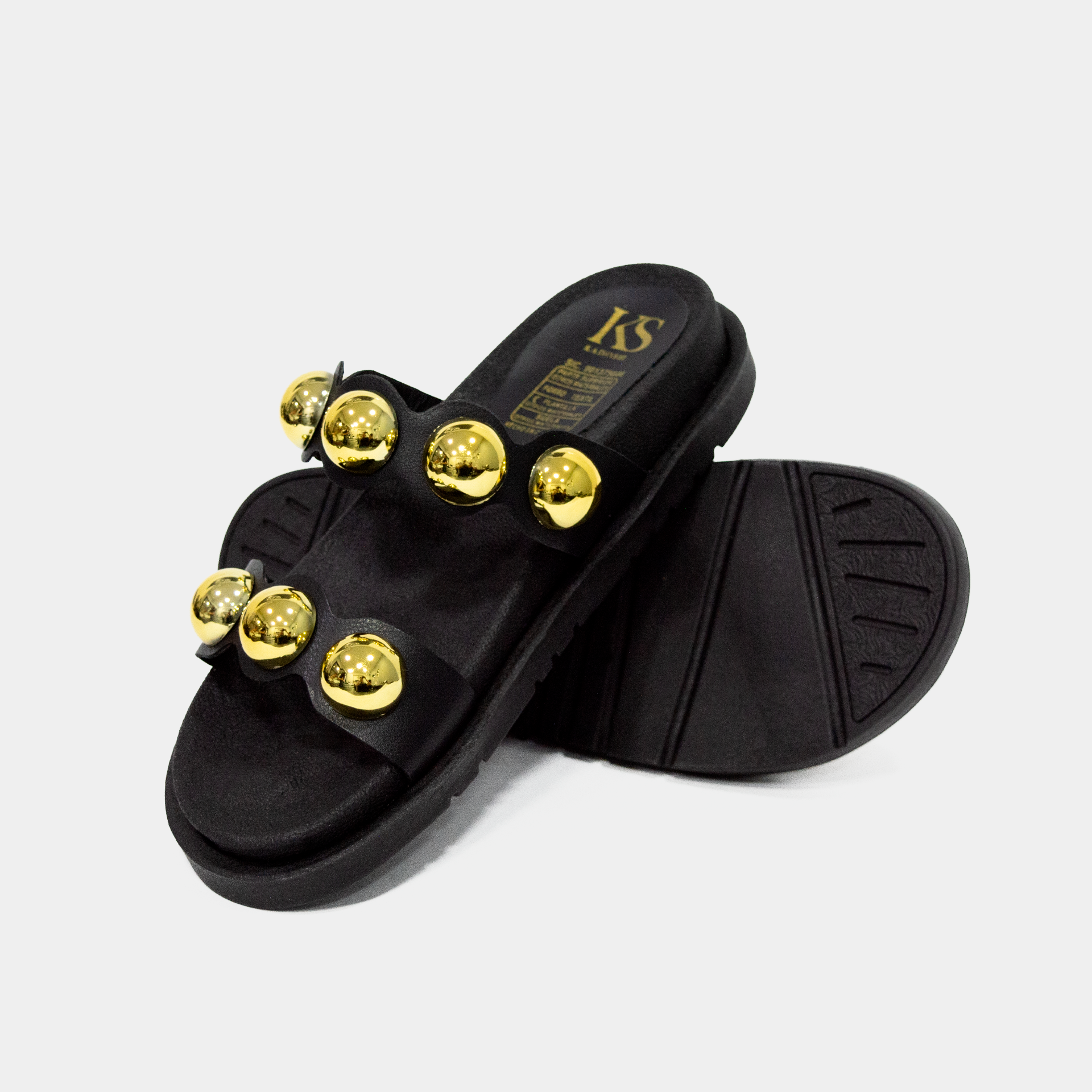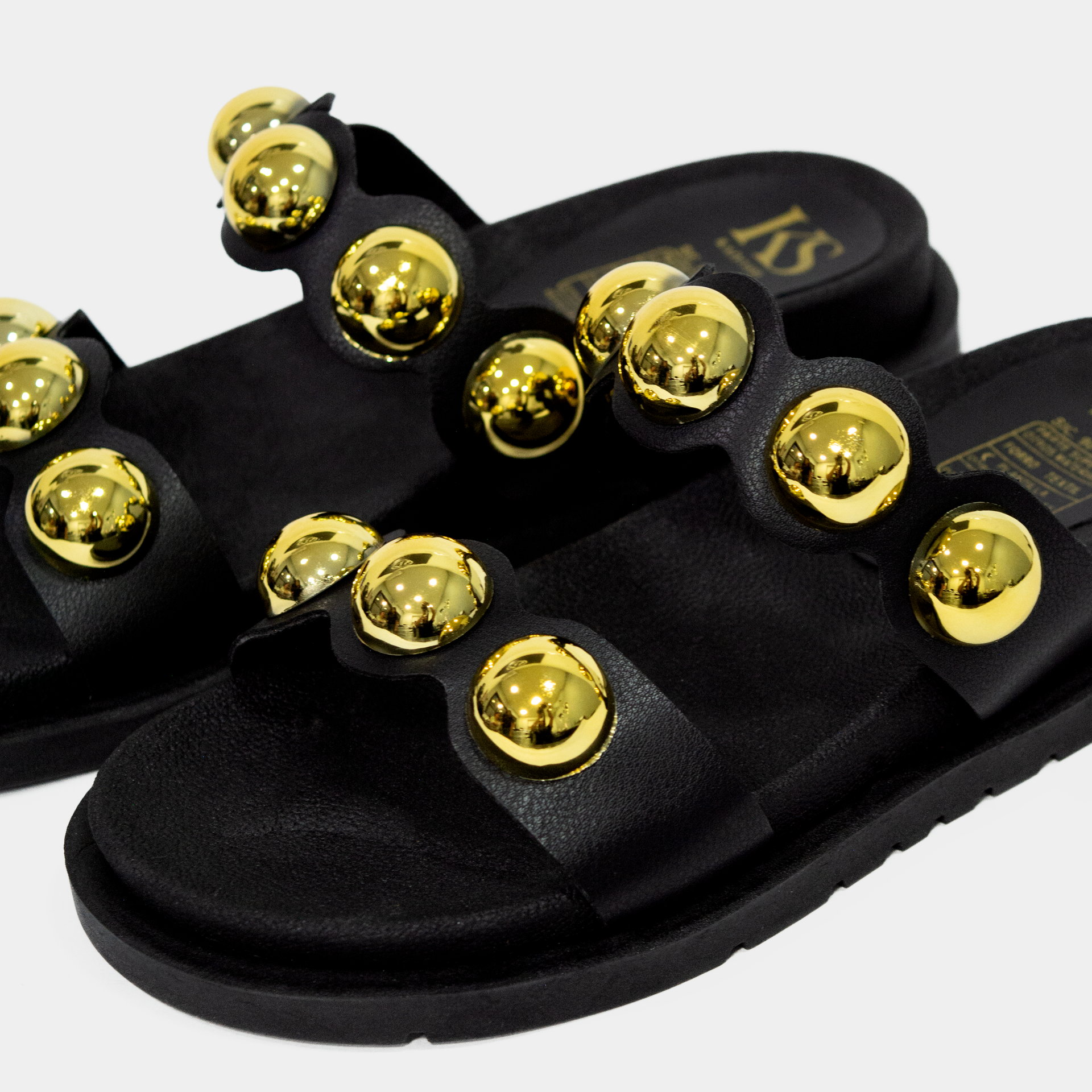 Esta sandalia destaca por su diseño moderno y atrevido, combinando una base negra de acabado mate con apliques metálicos dorados que le dan un toque de lujo y personalidad. Cuenta con dos tiras anchas decoradas con esferas doradas de alto brillo, creando un estilo sofisticado y llamativo que no pasa desapercibido.