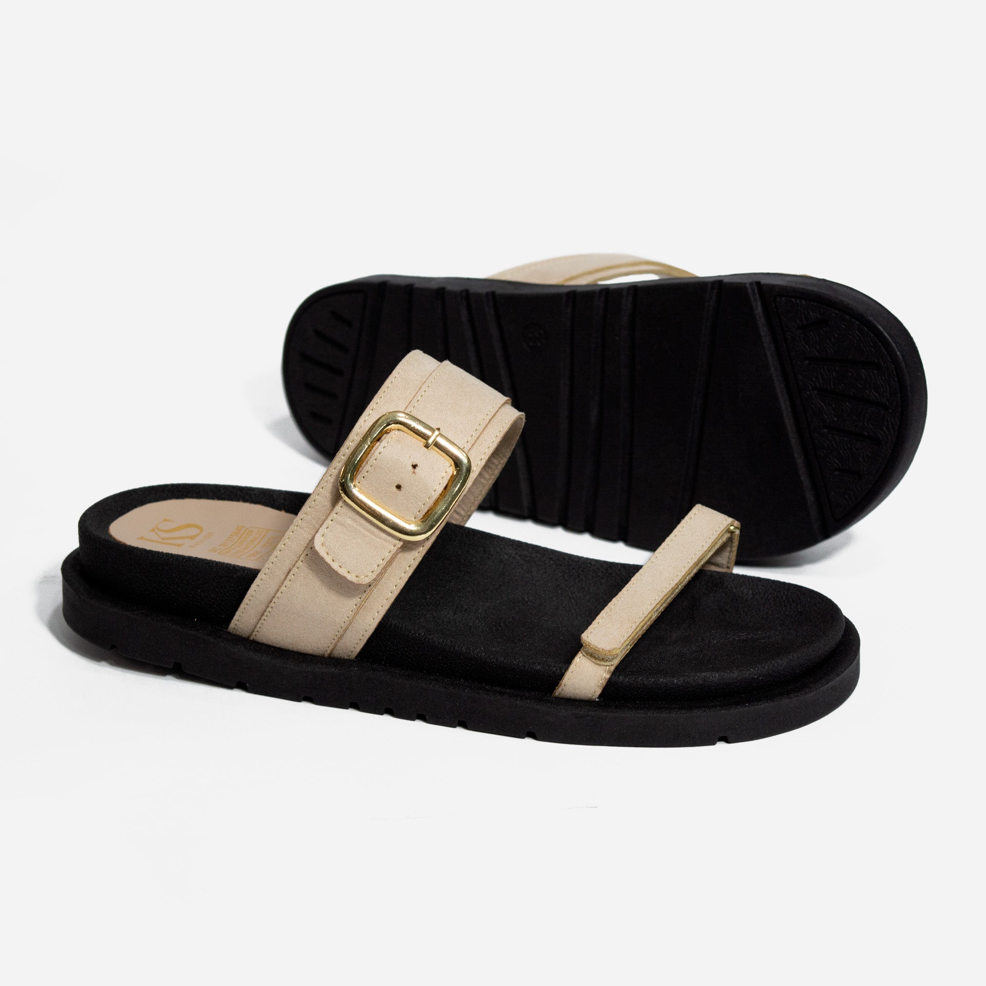 Descubre la fusión perfecta entre diseño minimalista y confort absoluto. Nuestra sandalia Selene cuenta con una plataforma ultraliviana en tono negro y dos tiras en suave gamuza beige: una ajustable con hebilla dorada que aporta elegancia y otra delgada al frente que estiliza visualmente el pie.