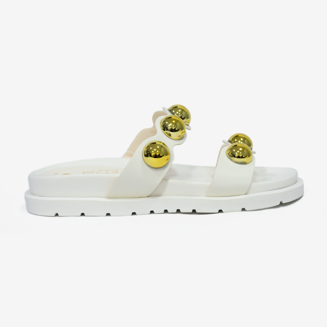 Esta sandalia destaca por su diseño moderno y atrevido, combinando una base beige de acabado mate con apliques metálicos dorados que le dan un toque de lujo y personalidad. Cuenta con dos tiras anchas decoradas con esferas doradas de alto brillo, creando un estilo sofisticado y llamativo que no pasa desapercibido.