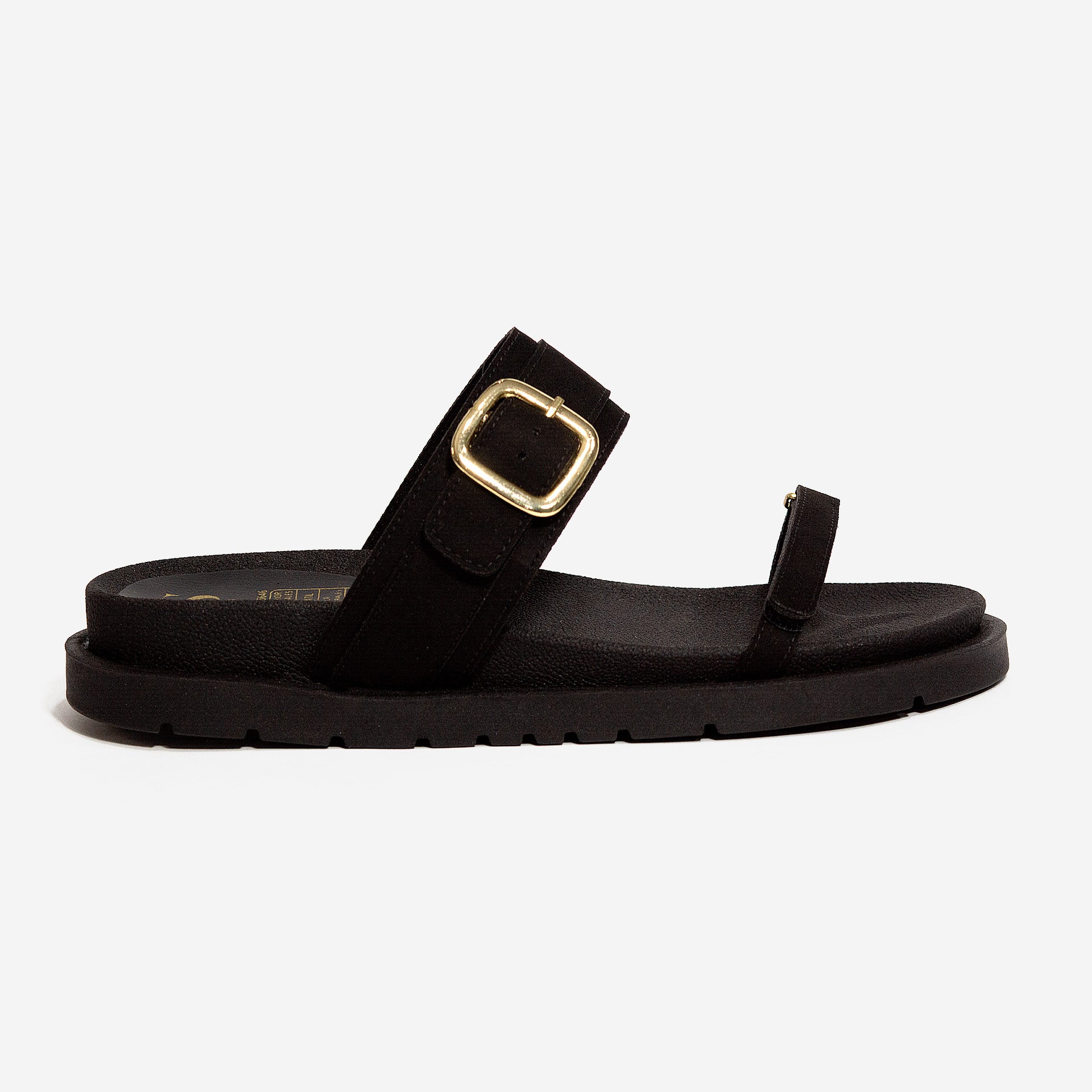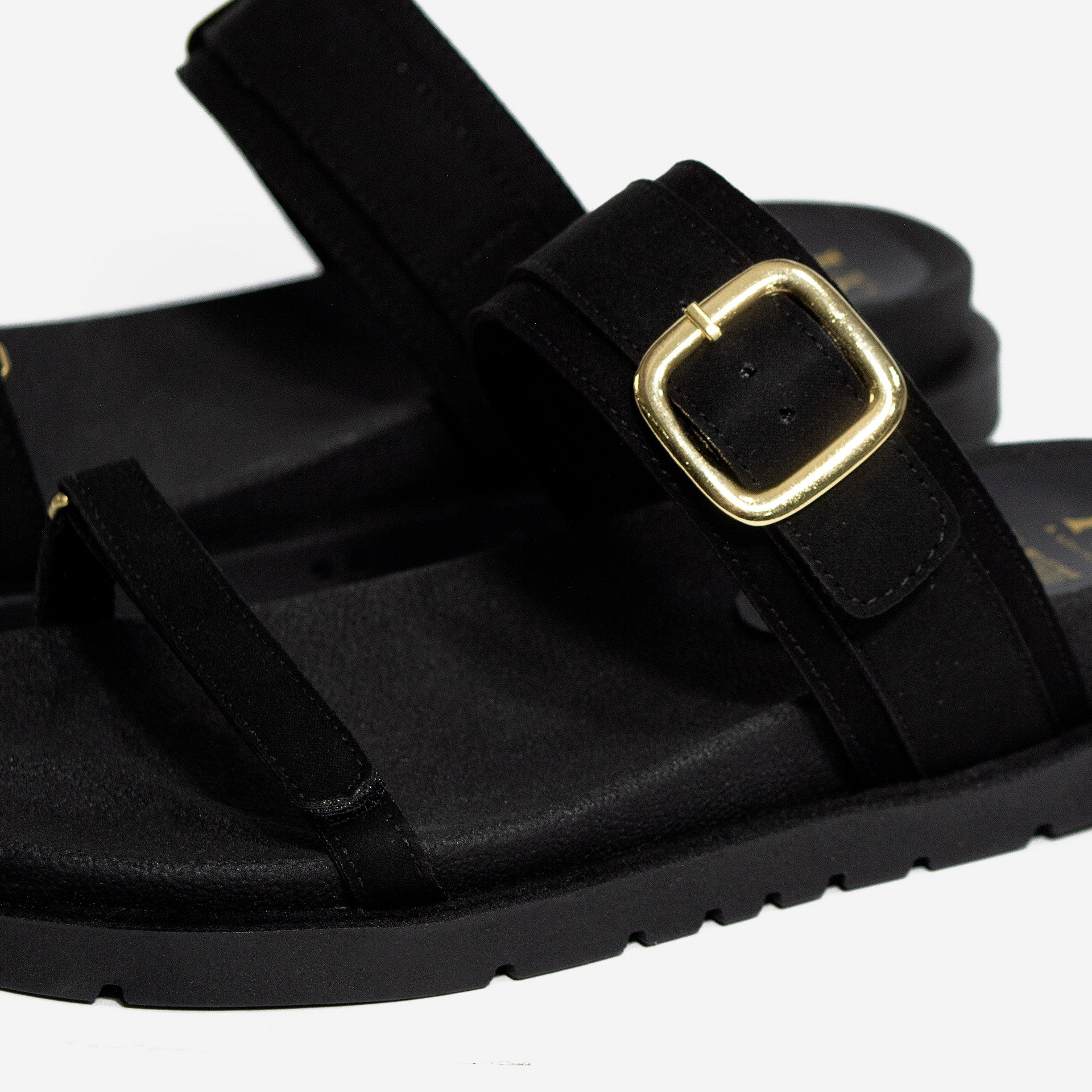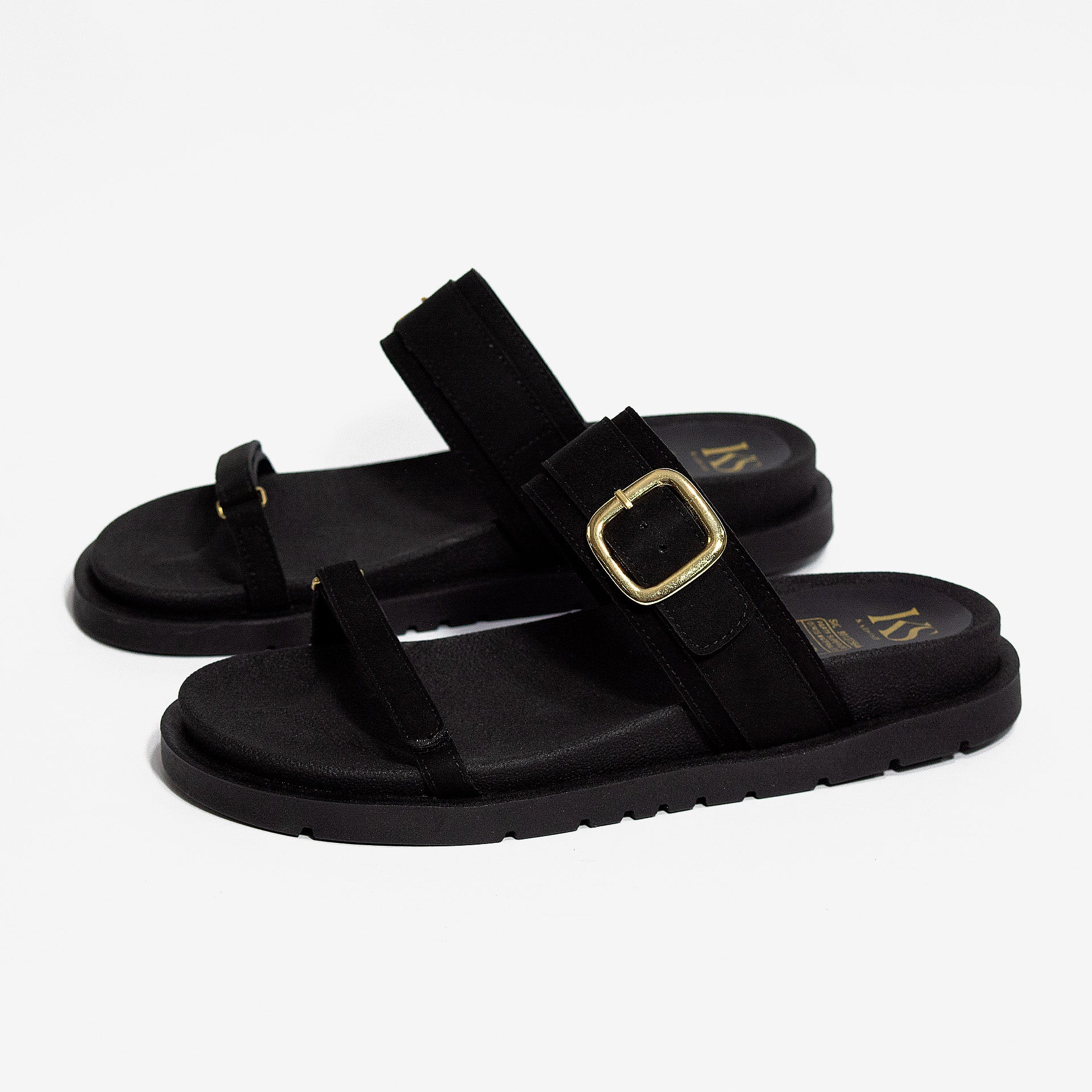 Descubre la fusión perfecta entre diseño minimalista y confort absoluto. Nuestra sandalia Selene cuenta con una plataforma ultraliviana en tono negro y dos tiras en suave gamuza negro: una ajustable con hebilla dorada que aporta elegancia y otra delgada al frente que estiliza visualmente el pie.